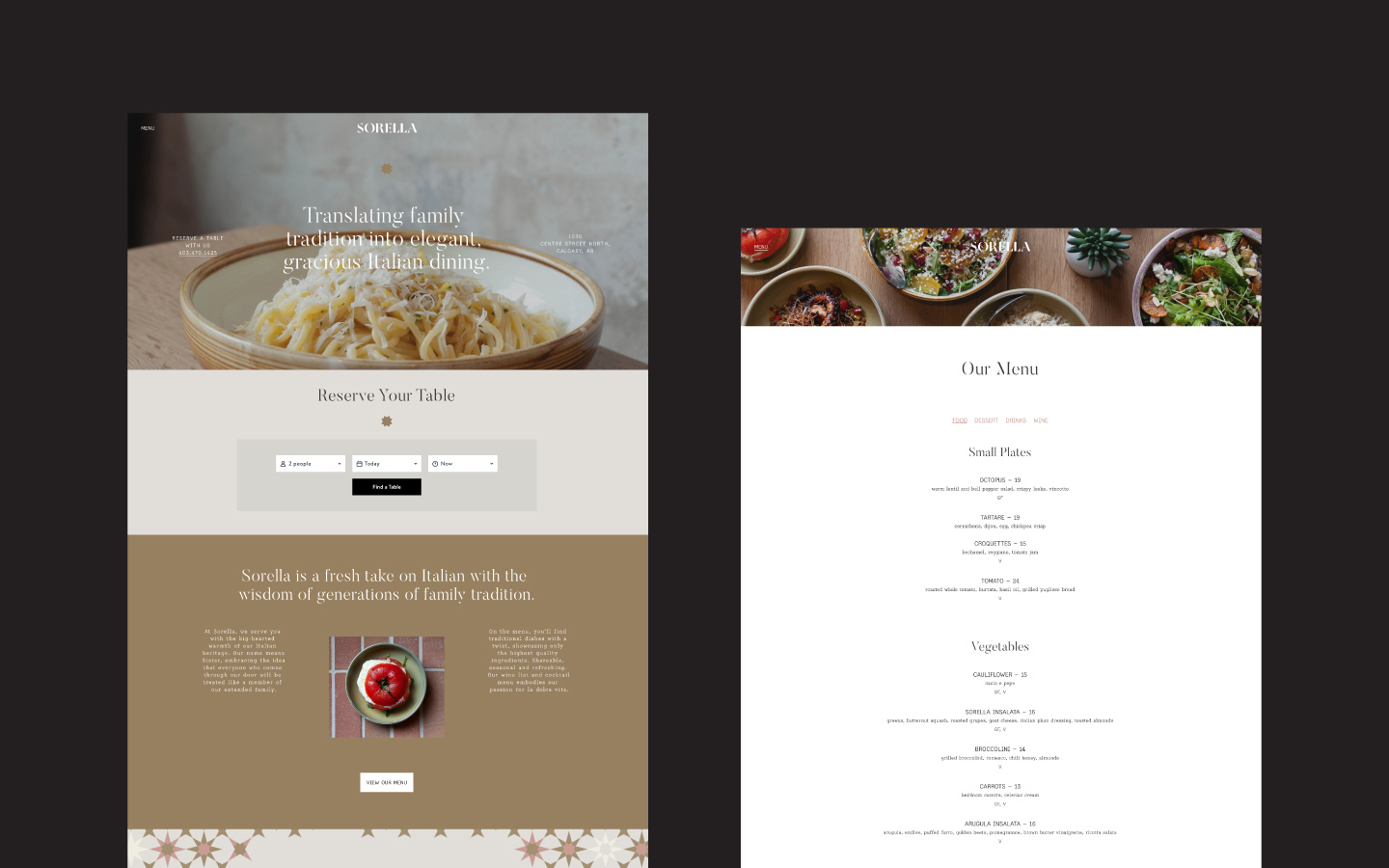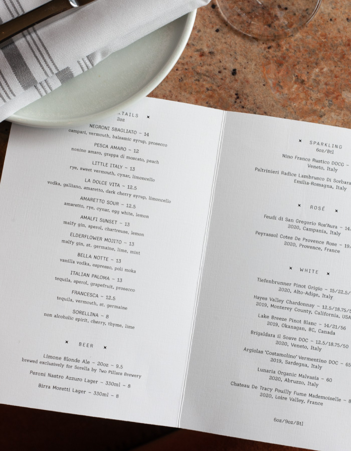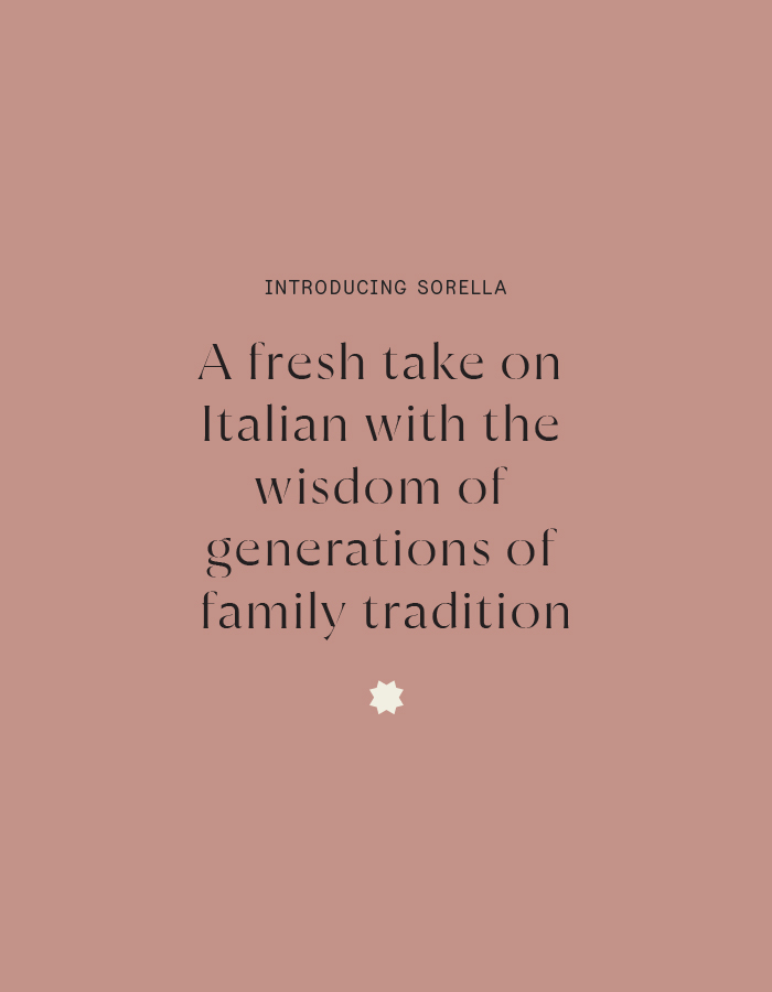 The team behind Calgary’s foremost Italian restaurant, Mercato, approached us to help envision a new restaurant in Crescent Heights. Grounded in the same traditions and values as Mercato, this new concept was to be contemporary, elegant, and stylish. Starting from scratch, we created a brand identity based around these shared values of family, quality, and tradition—all of which inspired the restaurant’s name, Sorella (Sister).