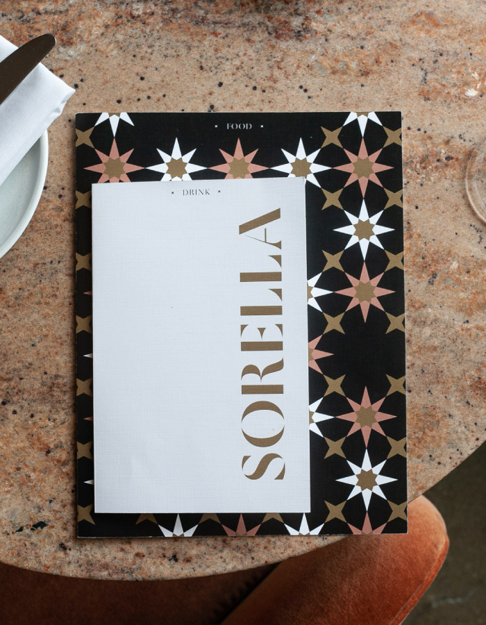 We came to this name after a comprehensive naming process which explored multiple concepts for the restaurant. The visual identity embraced the concept of Sorella as Mercato's younger, more expressive, stylish sibling, with the use of bold pattern, warm colours, and elegant gold signage.